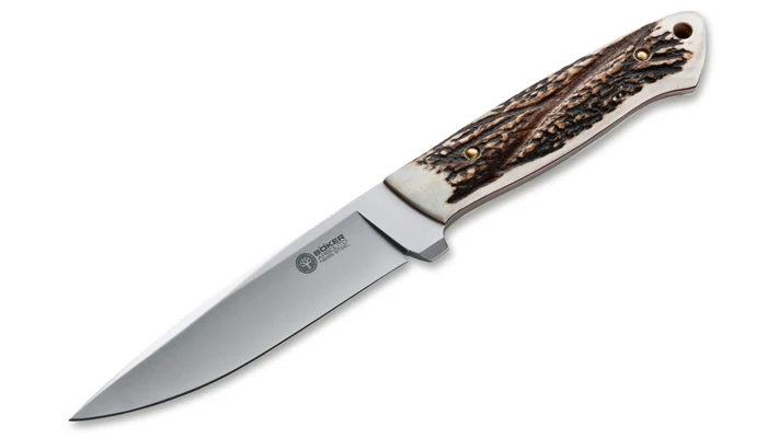 A Böker Arbolito Relincho Stag egy különleges vadászkés. Stílusok ízléses keveredése, a klasszikus és a modern egybeolvadása. A markolat agancsból készül, ami egy nosztalgikus és kihagyhatatlan klasszikus elem, ám ezt megvadítja a piros fiber alátét. A markolat formája szintén az ismert és nagyon bevált ergonómiai megoldás. Összességében a mindenkori vadászkés érzést adja vissza, ám ekkor jön a penge. Kecses, lendületes, markáns holker éllel. Mondhatni már-már klasszikus, de a ricasso kidolgozása, valamint a letisztult vonalak dinamizmusa ismét vadságot csempész a képbe. A penge anyaga rozsdamentes 440C acél. A to a legjobb argentin marhabőrből készül hozzá.