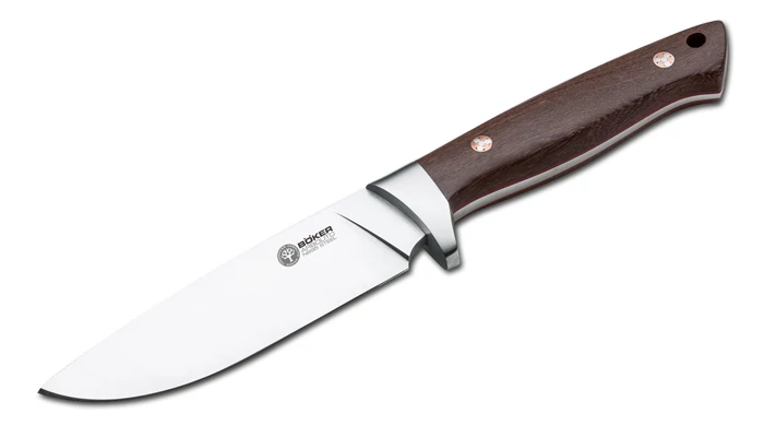 A Böker Arbolito Trapper egy klasszikus outdoor kés vadászatra, túrázásra, természetjárásra. Hagyományos vonalvezetésű drop point penge rozsdamentes 440C acélból. A visszafogott ricasso kiemeli az él ívét. A bakni, mely egyúttal kézvédő is, szintén rozsdamentes acélból készül, harmonizálva a pengével. A markolat kézzel válogatott ébenfa a tökéletes összhang végett és mozaikszegecsekkel lett rögzítve. Kijelenthetjük, a Trapper egy igazán szép kés. Minőségi marhabőr tok jár hozzá.
