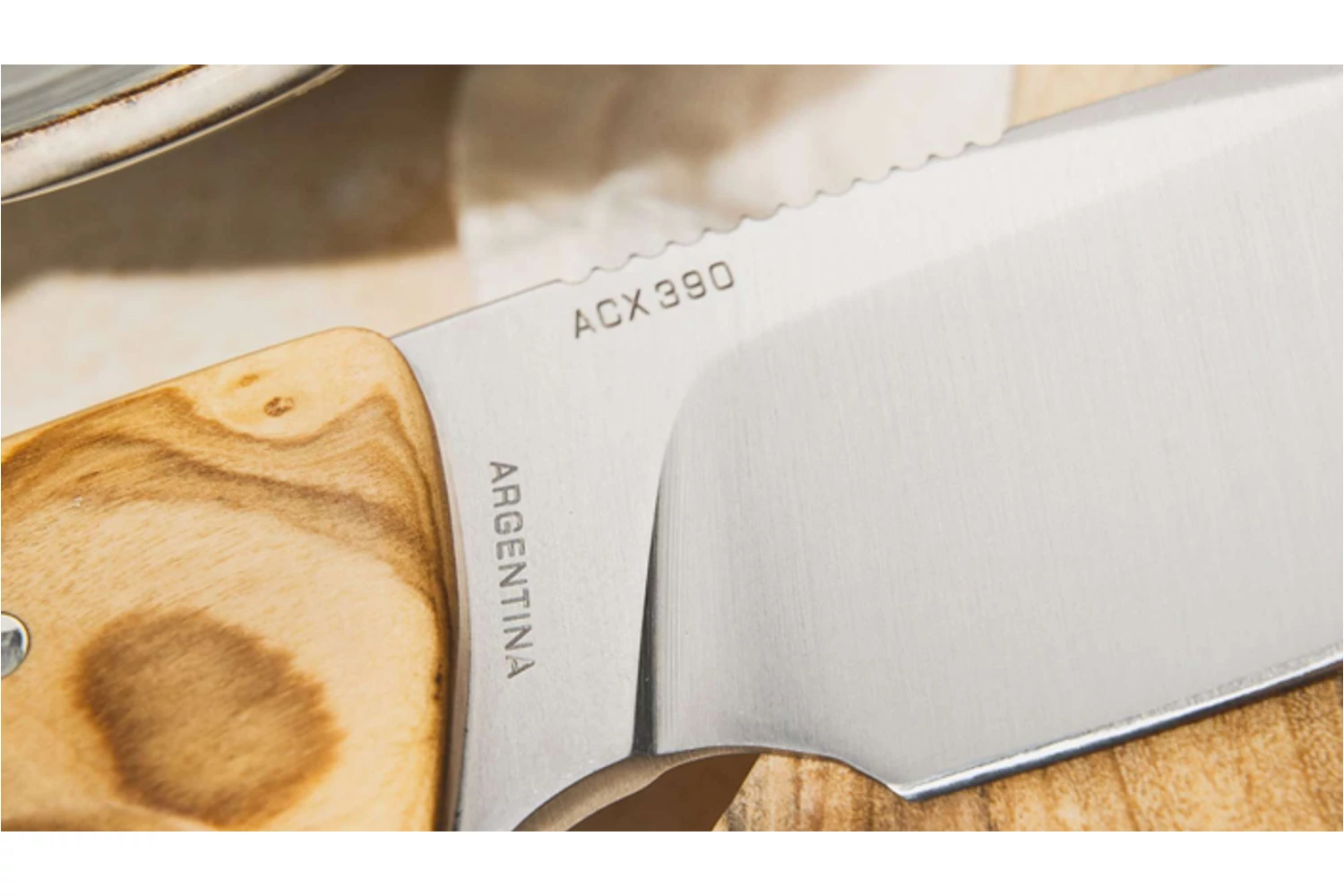A klasszikus drop point penge rozsdamentes ACX390 acélból készült szatén felülettel. Masszív ujjtámasz és choil található rajta, melyek a fogásváltások alkalmával növelik a stabilitást.