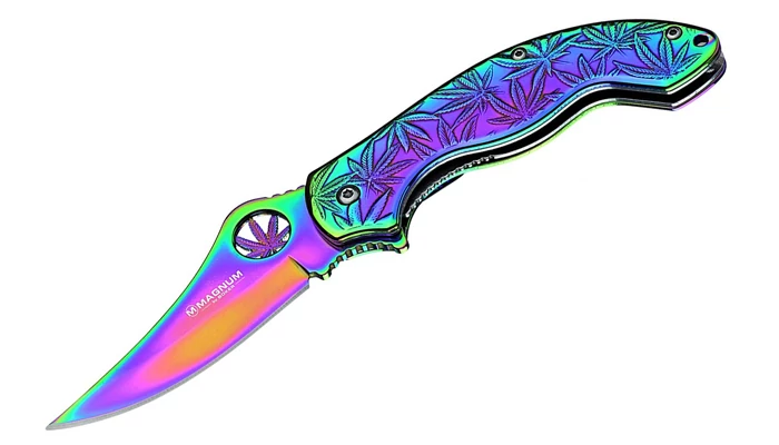 Igazán feltűnő zsebkés lázadozó jellemeknek. A szivárvány bevonatot a kender motívumok sokasága teszi még egyedibbé. A penge rozsdamentes 440A acél, kecses ívelt formavilággal. A markolat szintén rozsdamentes acél, és ívei mind a kényelmes fogást garantálják. A zsebkés neve egyúttal jelzés is. Mert Colorado államban már teljesen legális ennek a gyógyhatású növénynek a termesztése és egészségügyi használata. A zsinórluk és az övklipsz természetesen nem hiányozhat erről a modellről sem.