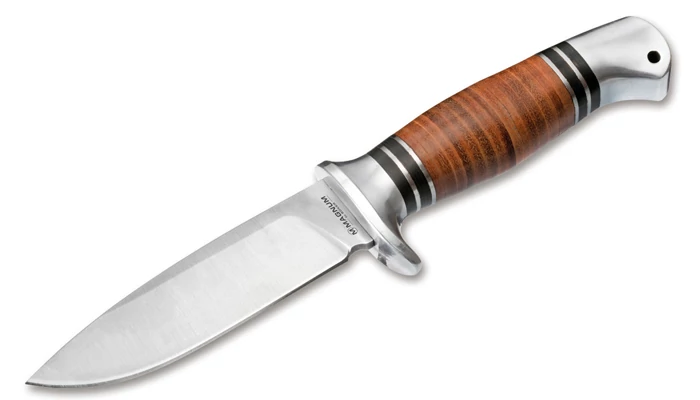 A Böker Magnum Leatherneck Hunter az egyik legszebb és legkülönlegesebb vadászkés a palettán. A markolat kialakításában keveredik a jelen és múlt. A forma a klasszikus vadászkéseknél bevált ergonómiai kialakítás. A rétegelt bőrgyűrűkből egybeforrasztott markolat és a tüskés kivitel a múltat idézi, de az alumínium bakni és végkupak már a jelen hírnöke. A drop pontos penge rozsdamentes 440A acélból készült. A kézvédő megakadályozza a kéz pengére csúszását. A tok szintén a modernebb korokat hirdeti. Praktikus nylon derékre fűzhető darab.