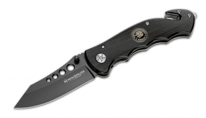 A Böker Magnum USN SEALS kést a világhírű elit osztagnak, a Navy Seals-nek ajánlották. A fekete alumínium markolatot a különleges egység emblémája díszíti. A 440 rozsdamentes acélból készült pengét keresztzár rögzíti stabilan a helyén. A pengén lévő könnyítőfuratok egyrészt csökkentik a kés súlyát, másrészt egyedi megjelenést is adnak. A markolat végén üvegtörő található, illetve egy övvágót is elhelyeztek rajta, ezért autós biztonsági felszerelésnek különösen ajánlott. A klipsz lehetővé teszi a kényelmes és biztonságos szállítást, hogy mindig kéznél legyen.