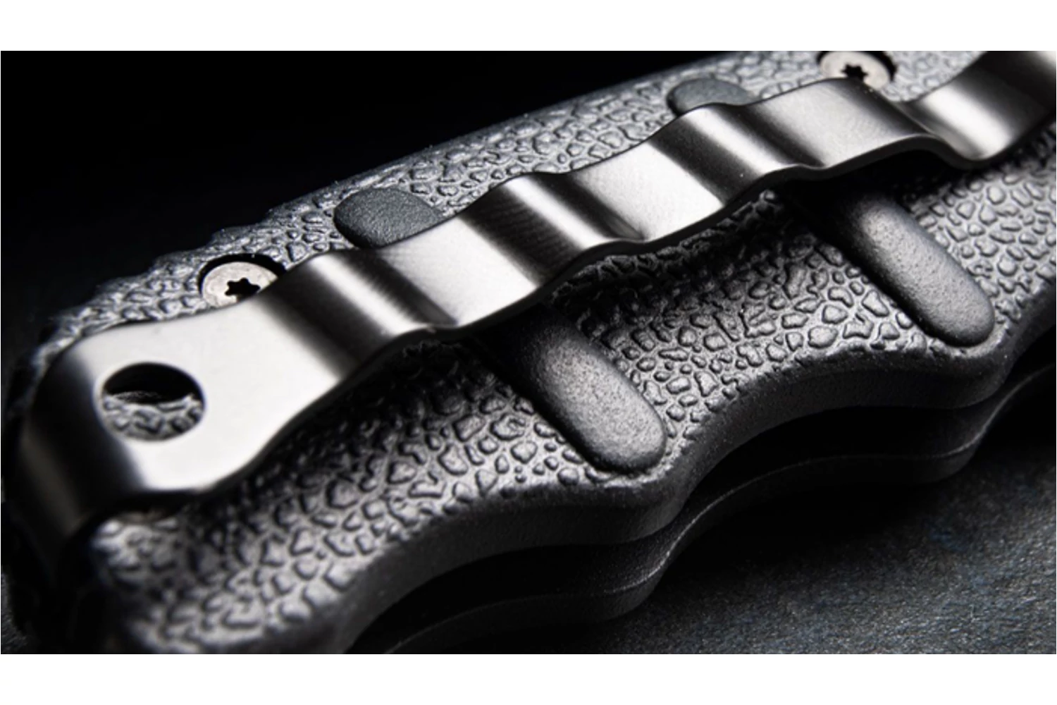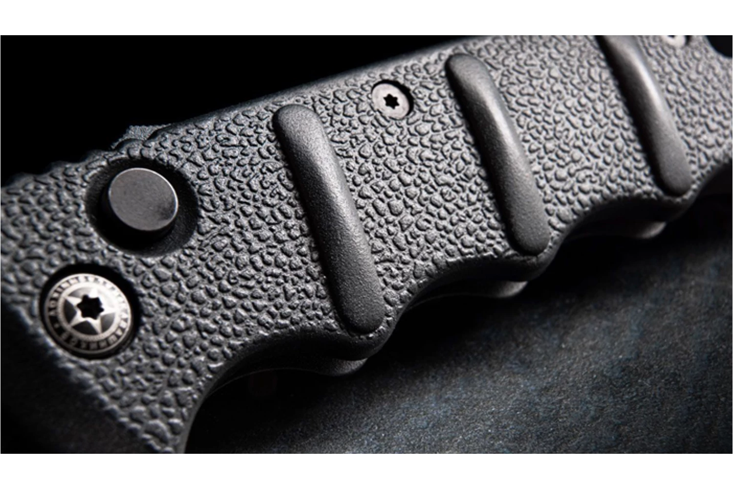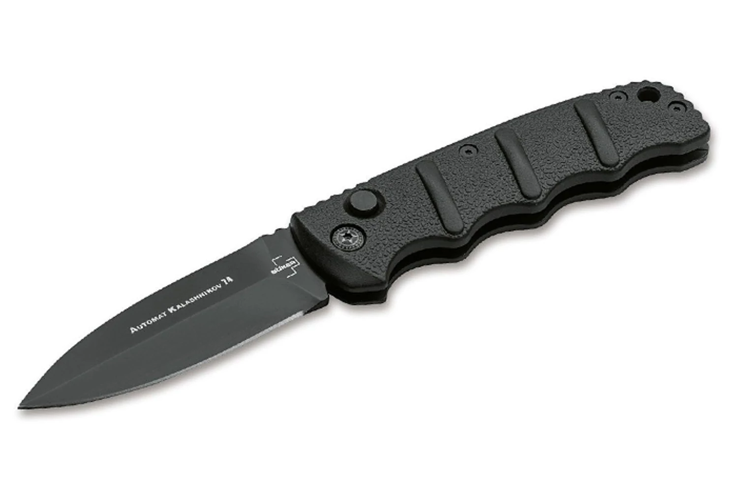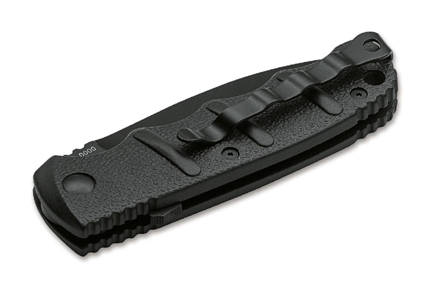 A hamis fokéllel ellátott spear point penge D2 szerszámacélból készült fekete bevonattal. A nyitást nyomógombos rugórásegítés végzi. A nyomógomb mélyen a markolatban ül, így gátolva a véletlenszerű kinyílást. A fekete eloxált alumínium markolat a legendás fegyver szuronyára emlékeztető kialakítást kapott. Elől és hátul bordázással a stabil tartás végett. A deep carry klipsz miatt a zsebkést diszkréten tárolhatjuk ruházatunkban.
