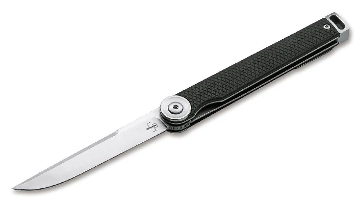 A markolat anyaga textúrázott G10. Egyenes vonala szépen követi a pengét. A csapágyat rejtő egyedi csavar pedig kellően megbolondítja ezt a minimalista egységet. Tökéletes megoldás a stílus kifinomult kedvelőinek. Maga a gyártó is úgy hivatkozik rá, hogy az „úri ember bicska”.
