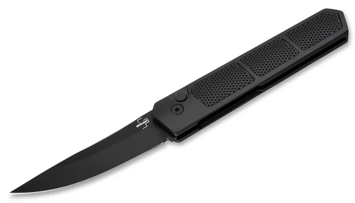 A klasszikus, japán vonalvezetésű penge erős D2 szerszámacélból készült fekete felülettel. Automata nyitásmechanizmus működteti, csak egy kézzel nyitható.