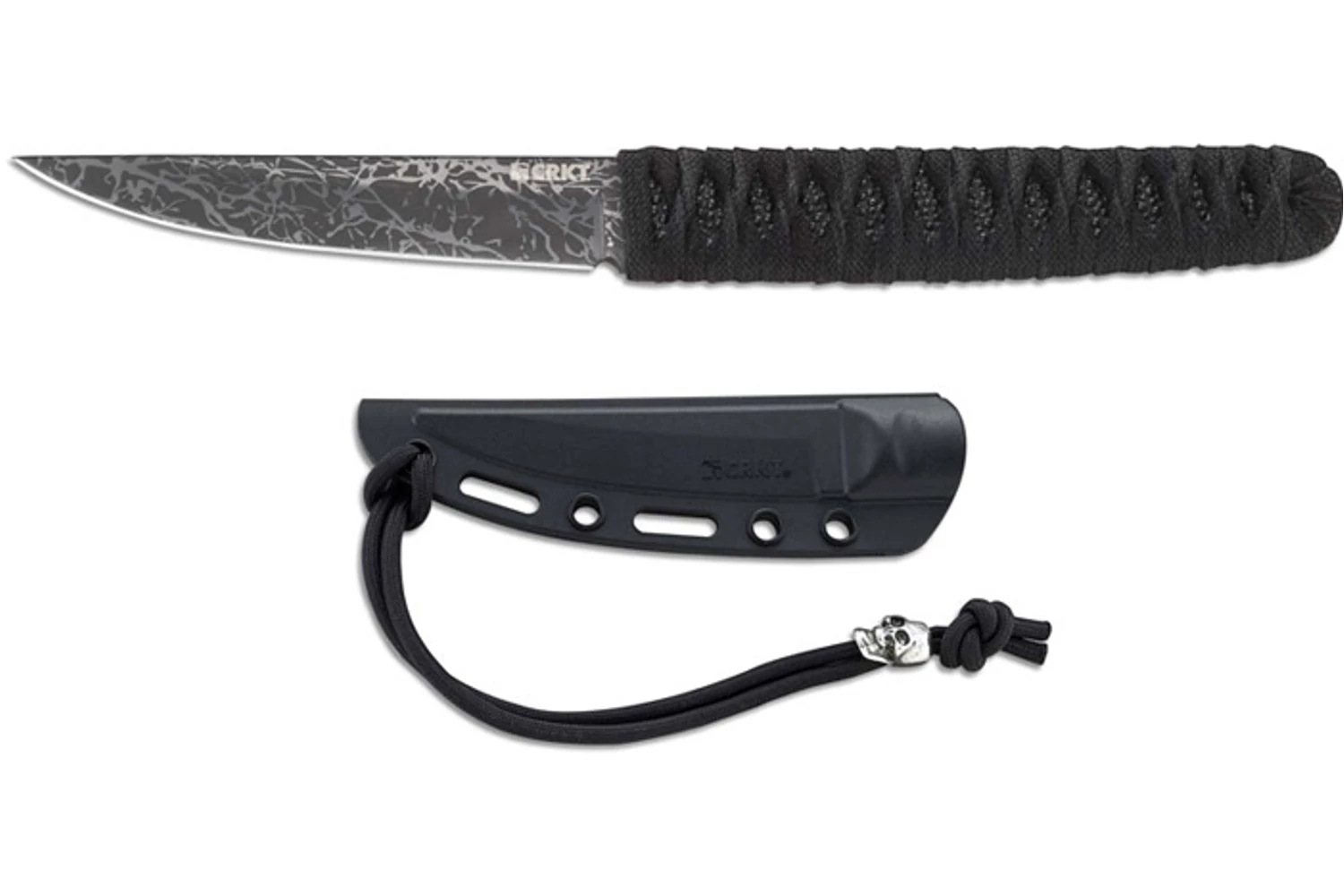 A full tang Kwaiken penge anyaga 8Cr14MoV acél márványmintás titán-nitrid bevonattal. Tradicionálisan csomózott zsinór markolattal készült. A tok modern üvegszálas anyagból készült taktikai elemekkel tarkítva és J kampóval ellátva.