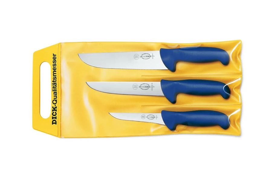 Dick 3 db-os késkészlet kék ErgoGrip markolattal. Népszerű, közkedvelt kés, mely nemcsak a hentes vagy a böllér kezében áll jól, de a konyhában is remekül alkalmazható csirke, sertés vagy hal feldolgozása során.