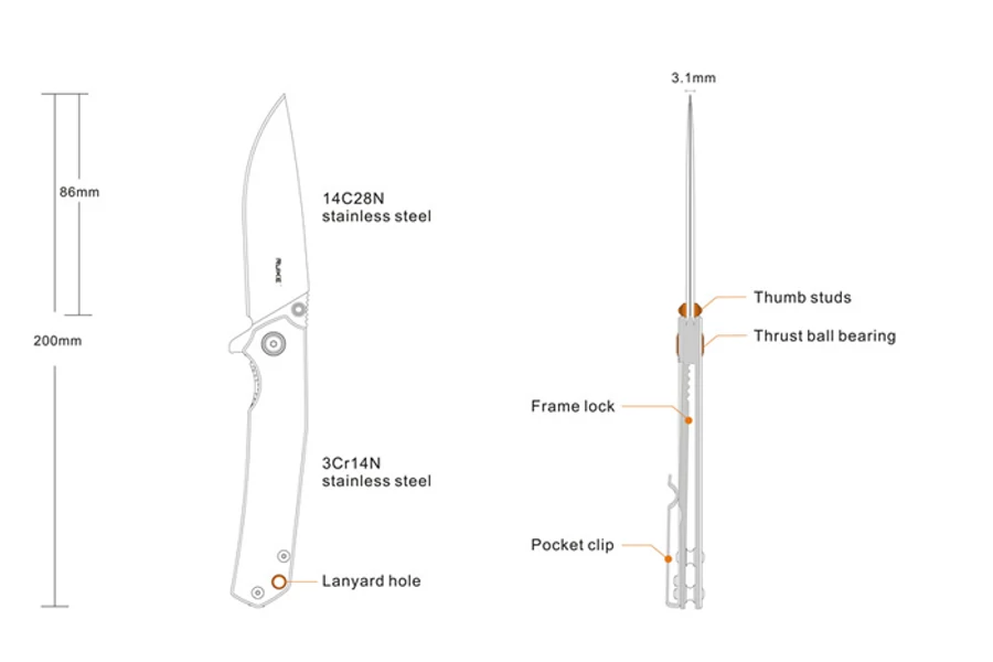 A Ruike P801-SF egy kimondottan elegáns EDC zsebkés. Letisztult vonalvezetésű minimalista stílusú modell. A penge rozsdamentes 14C28N acélból készült. Az egykezes használatot flipper és nyitószemölcs segíti.