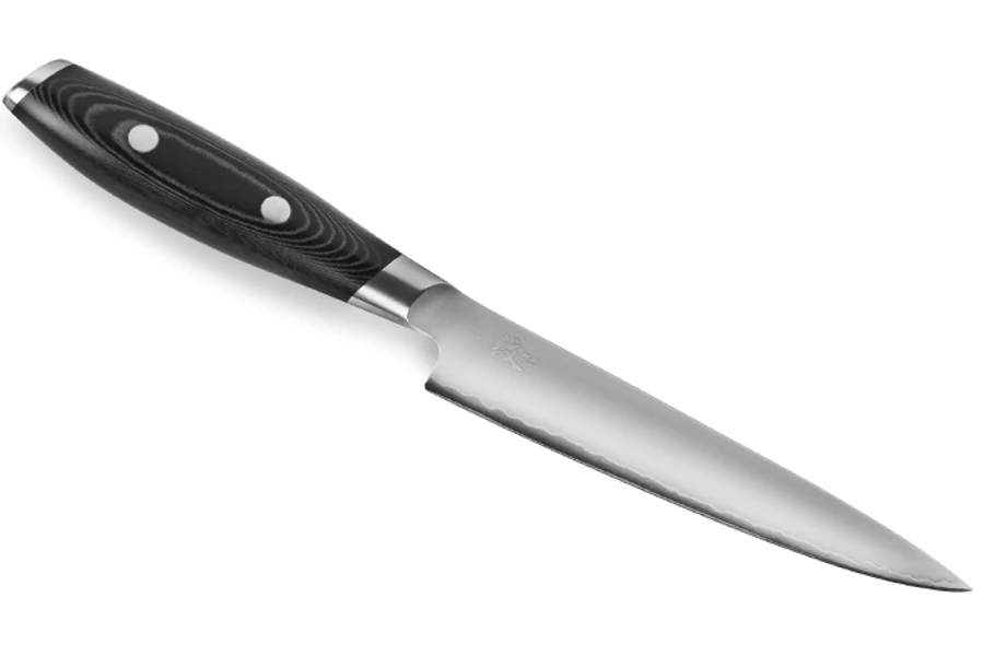 | Yaxell Mon Japán Konyhakés 18 cm-es damaszk pengével. Ez a modell az egyik legsokoldalúbb darabja a sorozatnak. Alkalmas zöldségek, gyümölcsök hámozására és feldolgozására. Kolbászok, sajtok, kisebb húsok szeletelésére, darabolására. A gyártó legnagyobb és legsikeresebb modellcsaládja. A penge a híres japán San Mai technológiával készül. Ez azt jelenti, hogy a középső réteg – a mag – keményebb, merevebb és éltartóbb, a jobb vágási teljesítmény érdekében. | |