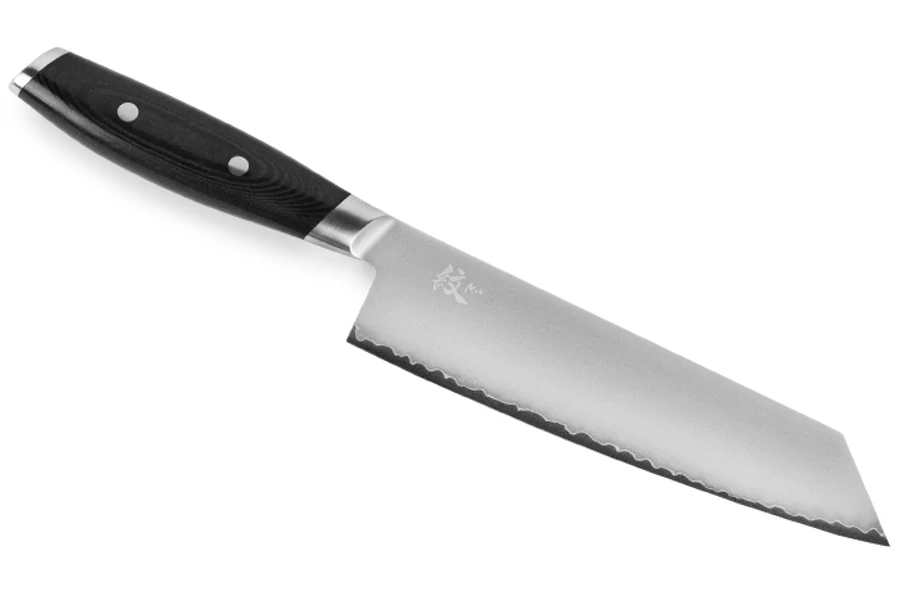 Yaxell Mon Japán Kiritsuke Szakácskés 20 cm-es damaszk pengével. A Kiritsuke szó szerinti fordításban azt jelenti: felmetszett. Ez a penge típus asszimetrikus és univerzálisnak tekinthető a japán konyhában és széleskörben használják, például sashimi előkészítésére vagy zöldségek, gyümölcsök finom aprítására. A gyártó legnagyobb és legsikeresebb modellcsaládja. A penge a híres japán San Mai technológiával készül. Ez azt jelenti, hogy a középső réteg – a mag – keményebb, merevebb és éltartóbb, a jobb vágási teljesítmény érdekében. |