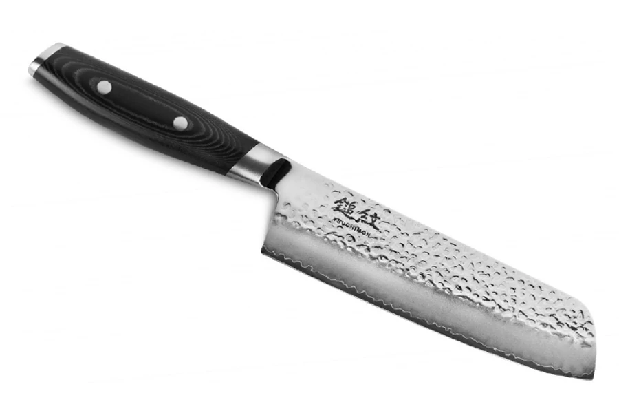 Yaxell Tsuchimon Japán Nakiri Szakácskés 18 cm-es damaszk pengével. Speciális formavilággal rendelkező japán szeletelőkés. Kiválóan alkalmas a zöldségek és gyümölcsök darabolására, feldolgozására. A Tsuchimon esetében a mag VG-10 rozsdamentes acélból készült 61HRC keményre edzve. (speciális edzési technológiát alkalmazva. Hevítés-jéghűtés-újabb hevítés) Ezt öleli körbe két puhább (55HRC) rozsdamentes acélréteg. A külső rétegen rusztikus kovácsolási mintázat található. A hamon vonal megidézi nekünk az ősi japán agyagos edzés hagyományát. |