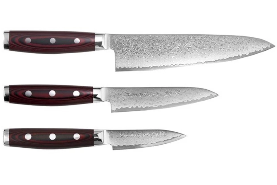 | Yaxell Super Gou Japán Késkészlet 3 db-os 37100-903. A késkészlet ideális összeállítás a konyhai feladatok elvégzésére. Húsok, zöldségek, gyümölcsök feldolgozására. A Super Gou esetében a mag SG2 Micro-Carbide rozsdamentes acélból készült 63HRC szuperkeményre edzve. (speciális edzési technológiát alkalmazva. Hevítés-jéghűtés-újabb hevítés) Ezt öleli körbe két puhább (55HRC) 161 rétegű damaszk acél. Így tisztelegve a kardkovácsolás ősi művészete előtt. | |