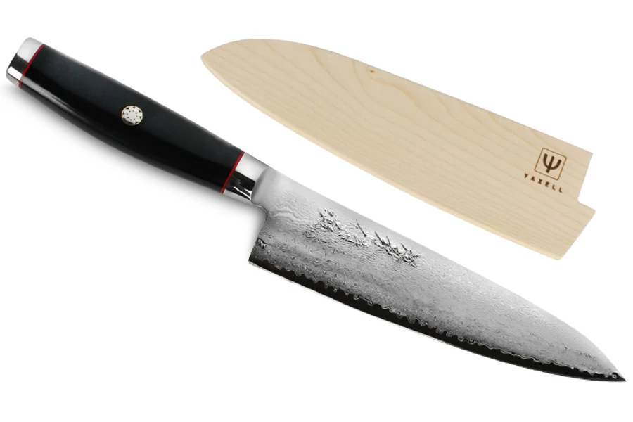 Yaxell Super Gou Ypsilon Japán Szakácskés 20 cm-es 193 rétegű damaszk pengével. Az európai stílusú szakácskés alapeleme minden konyhának. Igazi mindenes. Káposzták, saláták, zöldségek, nagyon gyümölcsök, húsok és halak feldolgozására alkalmas. A Super Gou Ypsilon esetében a mag SG2 Micro-Carbide rozsdamentes acélból készült 63HRC szuperkeményre edzve. (speciális edzési technológiát alkalmazva. Hevítés-jéghűtés-újabb hevítés) Ezt öleli körbe két puhább (55HRC) 193 rétegű damaszk acél. Így tisztelegve a kardkovácsolás ősi művészete előtt. Minden késnek más és más mintázata van, így minden darab teljesen egyedi. A hamon vonal megidézi nekünk az régmúlt japán agyagos edzés hagyományát. |