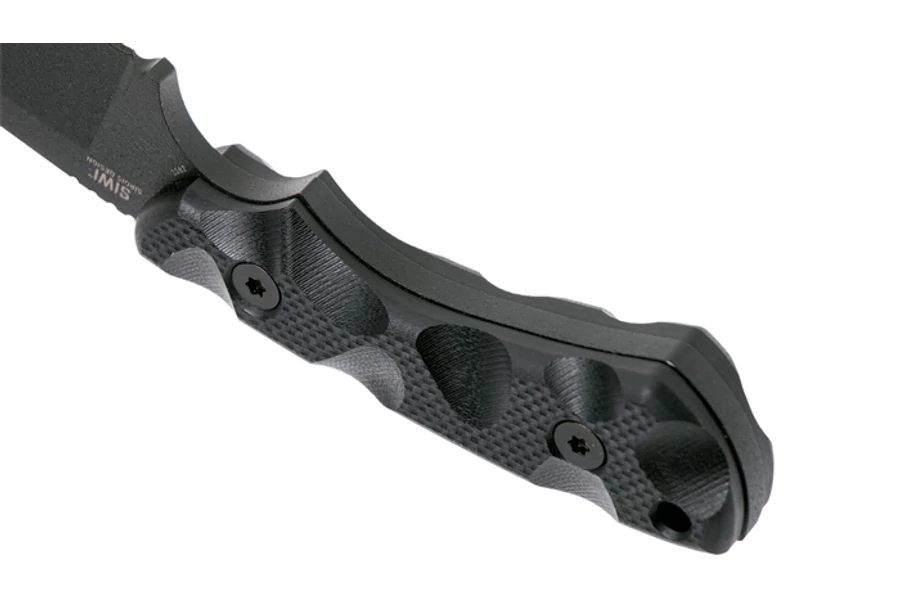 | A drop point penge fekete, csillogásmentesített bevonattal ellátott SK5 szénacélból készült. A bevonat védi az acélt a korróziótól. Az öblös él remek vágóképességgel ruházza fel a kést. A markolat ergonómiai kialakítású, textúrázott G10. Az ujjosztásoknak köszönhetően bombabiztosan tartható. Praktikus üvegszálas nylon tok jár hozzá adapterekkel. | |