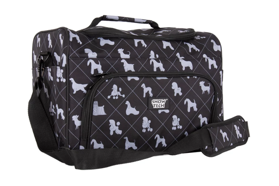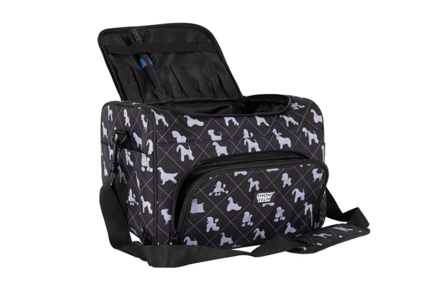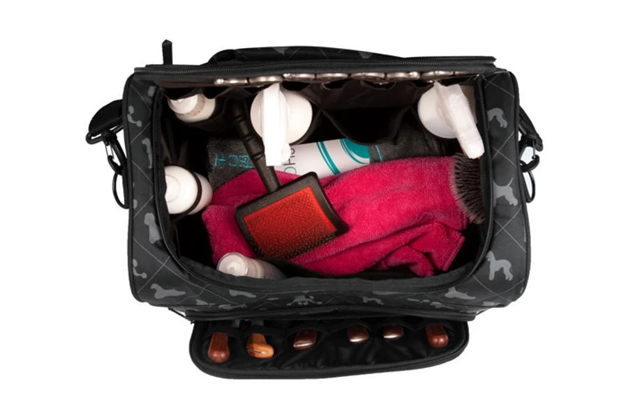 Víz- és Szőrálló anyagból készült, puha oldalú luxus Grooming Táska 6 belső zsebbel és 4 elasztikus hurokkal rendelkezik, hogy az üvegeket függőlegesen tartsa.