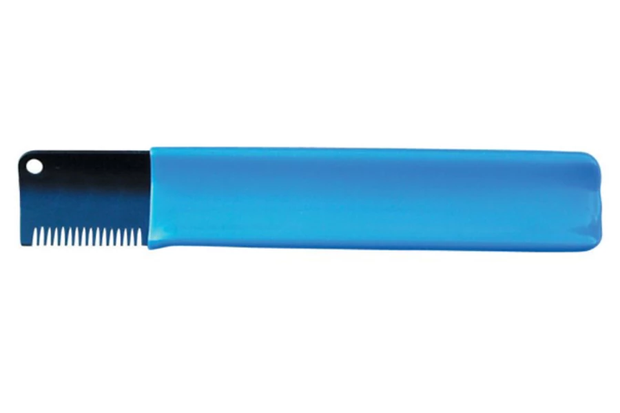 Íves, egy darabból készült, kényelmes fogást biztosító műanyag borítással ellátott ritkafogú trimmelőkés.
