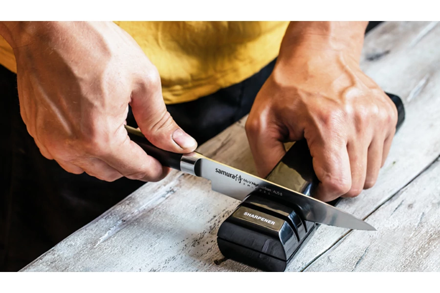 | A Samura gyorsélezője kifejezetten erre a célra készült. Két fázisú szerkezet, ami tökéletesen karbantartja a konyhai késeink élét. A durva sérüléseket a gyémánt élezővel lehet kijavítani, míg a finomabb vágóél felhúzásához a kerámia sablont kell használni. | |