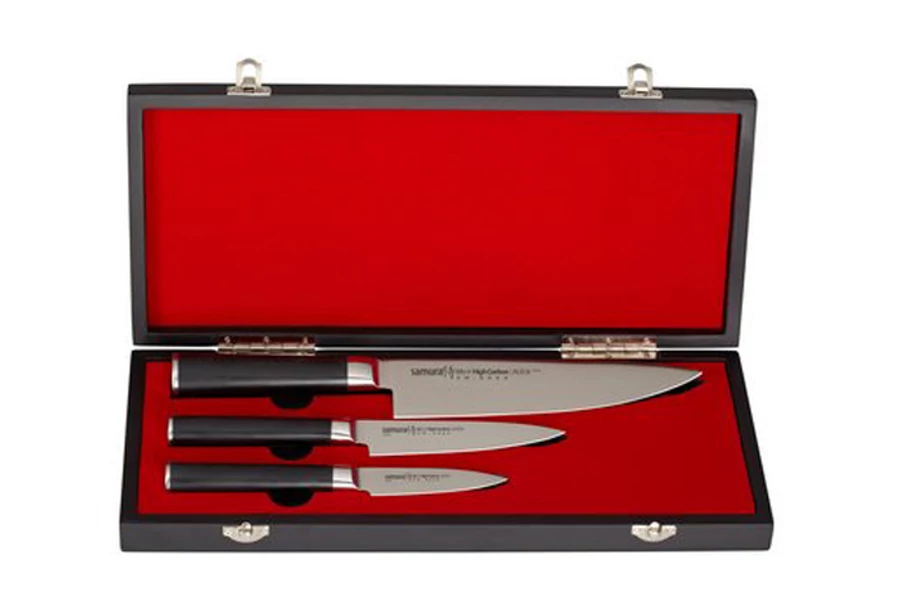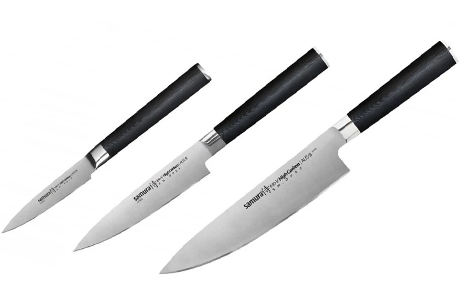 | Samura MO-V Set of 3 Knifes késkészlet. A Samura MO-V sorozata a legegyszerűbb megoldásokból és legegyszerűbb alapanyagokból hozta ki a legnagyszerűbb konyhakéseket. Iskolapéldája a „kevesebb néha több” esetnek. Az egyrétegű acél egyik tulajdonsága sem kimagasló, viszont nincsen kifejezett hátránya sem. | |