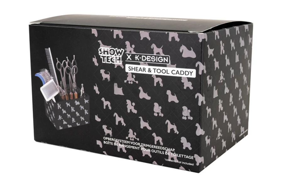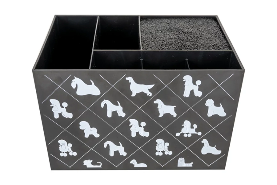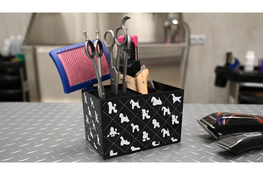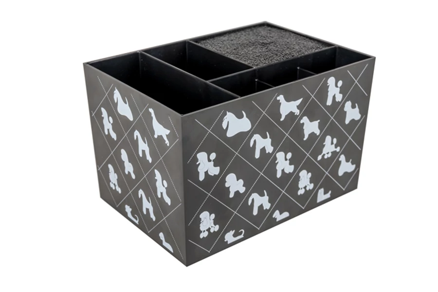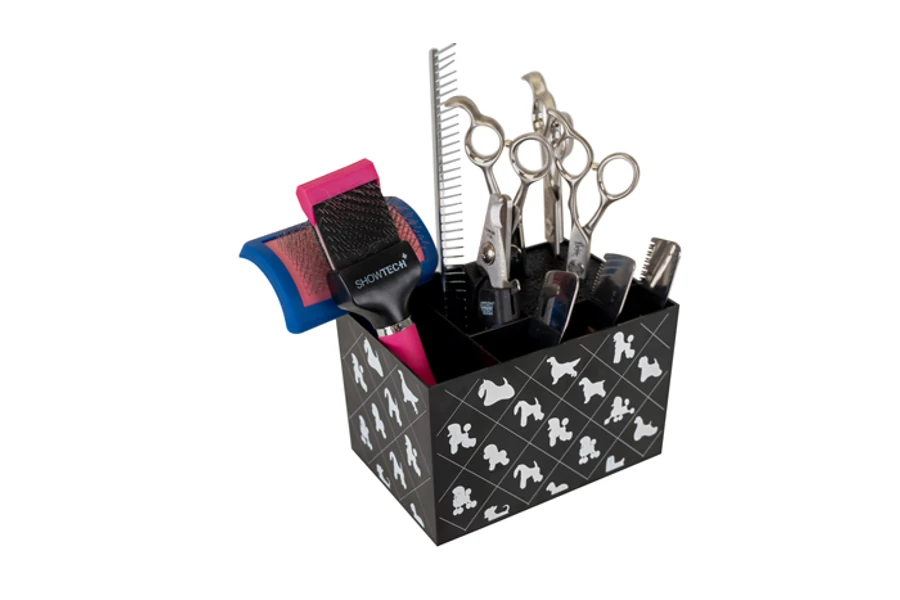 | Ez a praktikus, különböző rekeszekből álló doboz tökéletes megoldás a kisebb ápolási eszközök, mint például kefék, csipeszek, karomvágók, trimmelőkések és fésűk tárolására. Egy speciálisan kialakított rekesz pedig az ollók biztonságos tárolására alkalmas. Az egyszerűbb munka érdekében a szerszámtartót célszerű az asztalra helyezni. | |