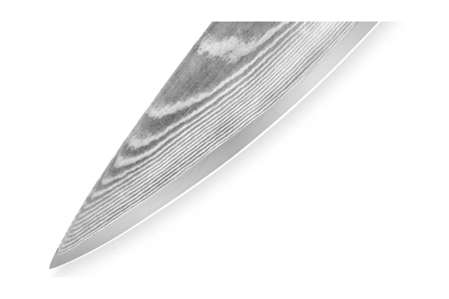 A Samura Damascus sorozat konyhakései az ősi damaszkuszi késkészítés minden hagyományát ötvözik a modern technológiai megoldásokkal. Korszakos szimbiózis, a múlt és a jelen tökéletes kapcsolata. A csodálatos pengék magja rozsdamentes acélból készült. Így a 61hrc keménységű él hihetetlen sokáig nem szorul karbantartásra. Ám ez önmagában még nem lenne elég a tökéletességhez. A 66 réteg lágyabb damaszkacél ellenállóvá teszi a késeket a terhelésekkel szemben. Emellett rabul ejti a szemet a kovácsolt rétegek varázslatos tánca a pengefelületen. Az ergonómiailag kialakított hengeres markolat G10 anyagból készült. Ellenálló a nedvességgel szemben, nagyon kényelmes és kiegyensúlyozottá teszi a késeket. A markolattüskés megoldás, az impregnált baknik és a lezárókupak rendkívüli megjelenést biztosít a késeknek. Nem elhanyagolható tény, hogy a Damascus sorozat könnyebb az átlagos konyhakéseknél, így fokozva a kényelmes, hatékony használatot.