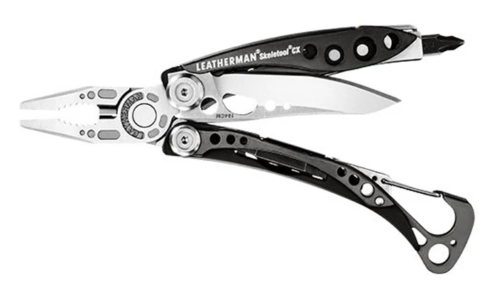A Leatherman SKELETOOL CX egy vagány megjelenésű minimalista EDC multitool eszköz a gyakorlatias felhasználóknak. A kényelmes, kompakt viselés jegyében a funkciók a legszükségesebb elemekre korlátozódtak. A további súlycsökkentés végett a szerszám szerkezete csontváz (skelet) stílusú. 154CM egyenes élű kés, drótvágó, félkerekcsőrű fogó, harapófogó, kábelvágó, laposbit foglalat, karabiner és üvegnyitó funkciók egy szerszámban. Kiváló prémium munkaeszköz a mindennapokra. A penge egy kézzel is nyitható és reteszelőzáras. Két duplafejű laposbit és leszerelhető övklipsz jár hozzá. A markolat DLC (Diamond Like Carbon) bevonatos carbon betéttel. A gyártó a termékre 25 év garanciát vállal.