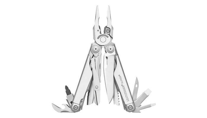 A Leatherman SURGE a gyártó WAVE modelljének funkcióit ötvözi a SUPER TOOL 300 modell robusztusságával. Igazi prémium EDC szerszám. Különlegességei: a pengék egykezes nyitásúak, a nagyméretű olló, az átfogó reteszelő mechanizmus és a bit befogó. Így kiegészítő bitekkel az amúgy is impozáns funkcióskála jelentősen bővíthető. 22cm/9" mérőskála, 420HC egyenes élű kés, 420 HC recézett élű kés, ár (lyukasztó), fűrész, fa/fém reszelő, cserélhető drótvágó pengék, cserélhető kábelvágó pengék, félkerekcsőrű fogó, harapófogó, gyémántpor bevonatos reszelő, kábelcsupaszoló, kábelvágó, kábelvágó sodrott kábelhez, konzervnyitó, laposbit foglalat, nagyméretű olló, nagy csavarhúzó, üvegnyitó és pengefoglalt funkciók egy szerszámban. Kiváló prémium munkaeszköz a mindennapokra. Egy duplafejű bit jár hozzá, illetve egy bőr vagy gyöngyvászon tok. A gyártó a termékre 25 év garanciát vállal.
