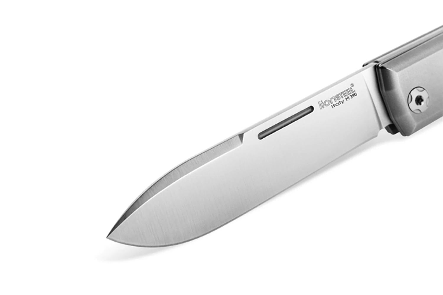 A penge csúcsminőségű porkohászati M390 acélból készült szatén felülettel. A markolat anyaga micarta. Az oldallemezek és a baknik tömör titánból készültek