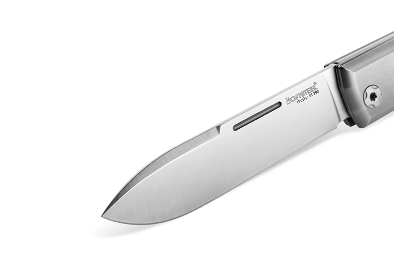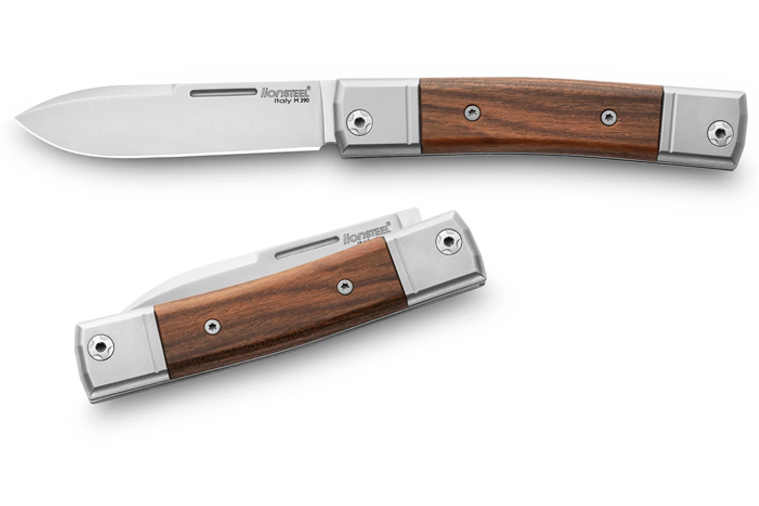 A penge csúcsminőségű porkohászati M390 acélból készült szatén felülettel. A markolat anyaga Santos fa. Az oldallemezek és a baknik tömör titánból készültek