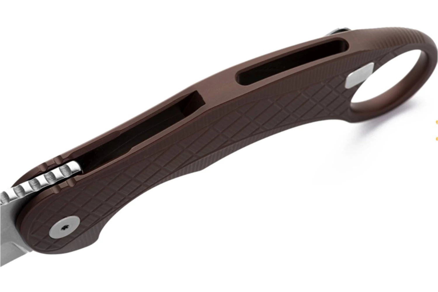 A markolat anyaga eloxált alumínium beleértve a jellegzetes ujjgyűrűt is. A finom textúrázás segíti a csúszásmentes fogást. A biztonságról framelock (keretzár) gondoskodik. A zár nagyon stílusos megoldással lett kialakítva, nincsen a framelockos bicskákra jellemző „felemás” markolat effektus. A zsebklipsz leszerelhető.