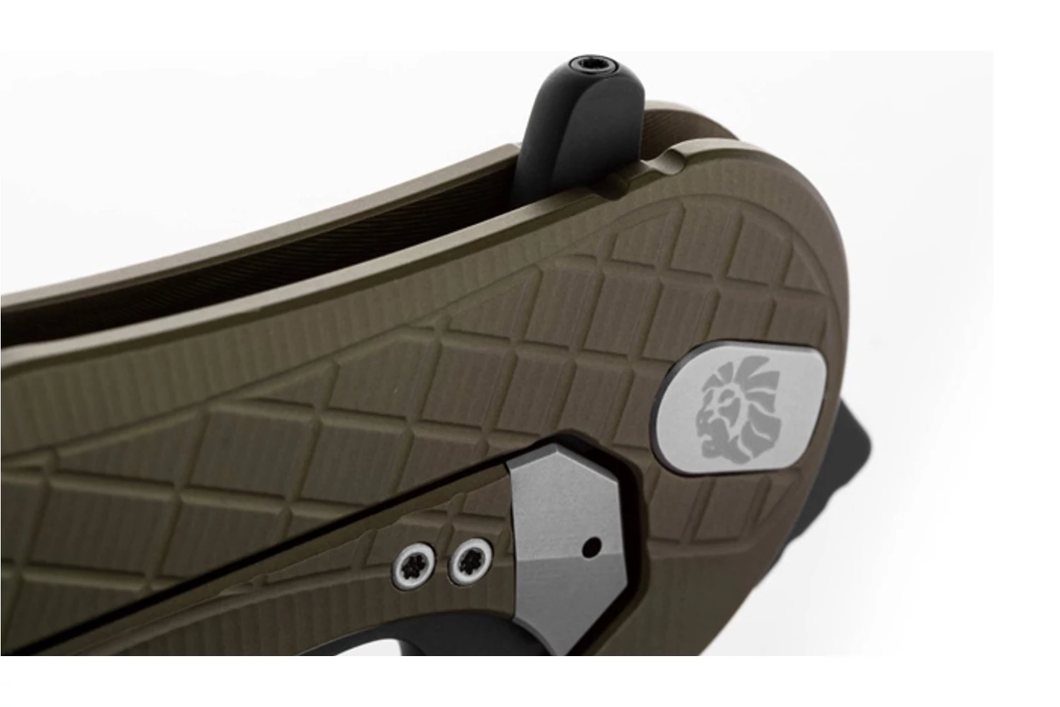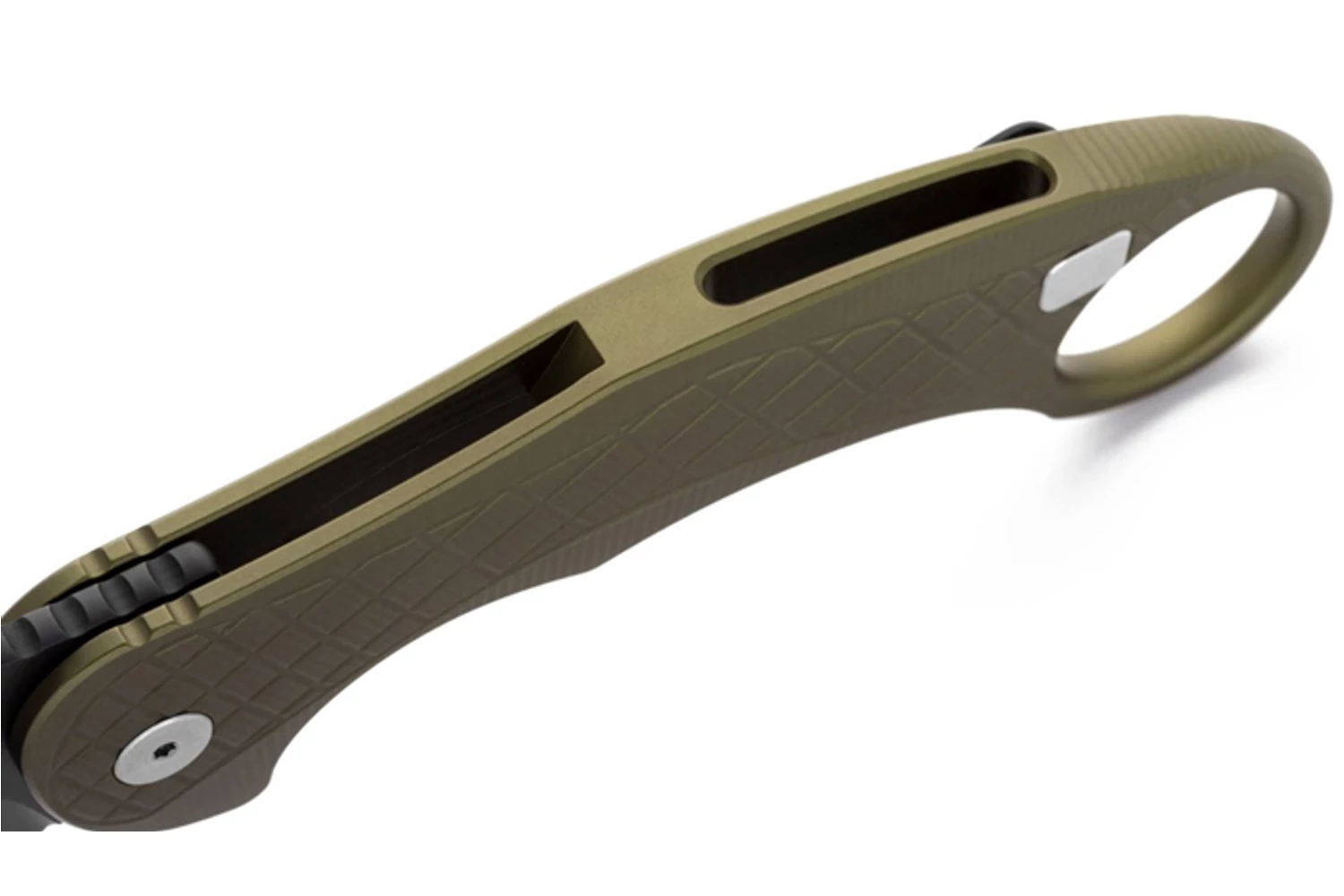 A markolat anyaga eloxált alumínium beleértve a jellegzetes ujjgyűrűt is. A finom textúrázás segíti a csúszásmentes fogást. A biztonságról framelock (keretzár) gondoskodik. A zár nagyon stílusos megoldással lett kialakítva, nincsen a framelockos bicskákra jellemző „felemás” markolat effektus. A zsebklipsz leszerelhető.