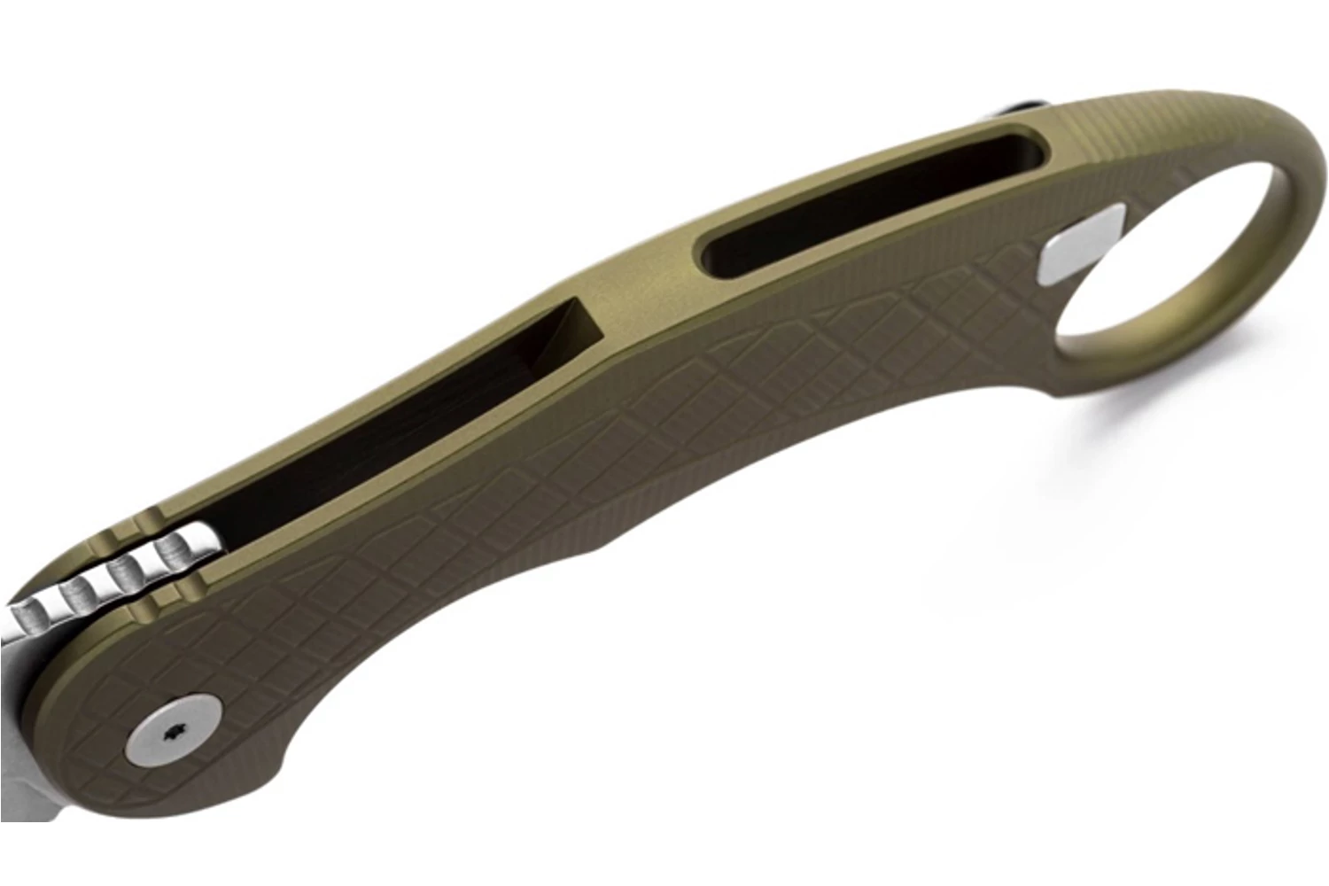 A markolat anyaga eloxált alumínium beleértve a jellegzetes ujjgyűrűt is. A finom textúrázás segíti a csúszásmentes fogást. A biztonságról framelock (keretzár) gondoskodik. A zár nagyon stílusos megoldással lett kialakítva, nincsen a framelockos bicskákra jellemző „felemás” markolat effektus. A zsebklipsz leszerelhető.