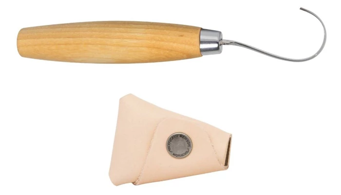 A Wood Carving Knife 164 egy speciális faragókés. Horog formájú pengéje rozsdamentes acélból készült kifejezetten jobbkezesek számára. Íve végett tökéletesen alkalmas csanakok, kanalak belső homorú felületének kialakítására. A penge tövében biztonságos ujjtámasz is található. A fa markolat kényelmes és stabil fogást biztosít munkavégzés közben. Cserzett növényi bőrtok jár hozzá.