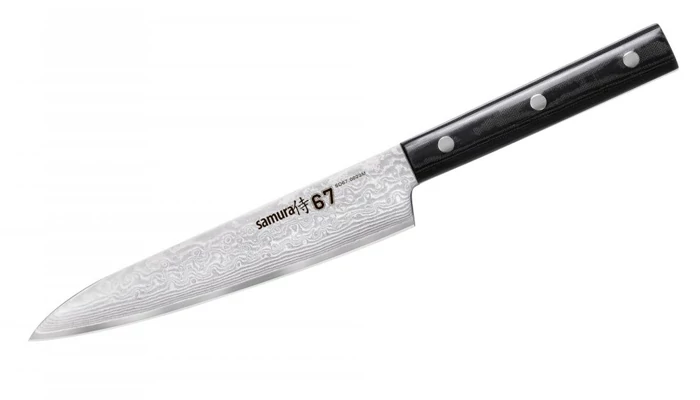 A Samura Damascus 67 konyhakéseket először 2017-ben adta ki a gyártó. Ez a sorozat az ősi damaszkuszi késkészítés minden hagyományát ötvözi a modern technológiai megoldásokkal. Korszakos szimbiózis, a múlt és a jelen tökéletes kapcsolata. A csodálatos pengék magja VG-10 rozsdamentes acélból készült kobalt ötvözettel. Így a 61hrc keménységű él hihetetlen sokáig nem szorul karbantartásra. Ám ez önmagában még nem lenne elég a tökéletességhez. A 66 réteg lágyabb damaszkacél ellenállóvá teszi a késeket a terhelésekkel szemben. Emellett rabul ejti a szemet a kovácsolt rétegek varázslatos tánca a pengefelületen. Az ergonómiailag kialakított ovális markolat micarta anyagból készült. Ellenálló a nedvességgel szemben, nagyon kényelmes és kiegyensúlyozottá teszi a késeket. Három szegeccsel rögzített felfogatása bírja a kemény igénybevételt. Nem elhanyagolható tény, hogy a Damascus 67 sorozat könnyebb az átlagos konyhakéseknél, így fokozva a kényelmes, hatékony használatot.