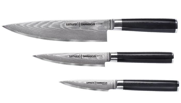 A Samura Damascus sorozat konyhakései az ősi damaszkuszi késkészítés minden hagyományát ötvözik a modern technológiai megoldásokkal. Korszakos szimbiózis, a múlt és a jelen tökéletes kapcsolata. A csodálatos pengék magja rozsdamentes acélból készült. Így a 61hrc keménységű él hihetetlen sokáig nem szorul karbantartásra. Ám ez önmagában még nem lenne elég a tökéletességhez. A 66 réteg lágyabb damaszkacél ellenállóvá teszi a késeket a terhelésekkel szemben. Emellett rabul ejti a szemet a kovácsolt rétegek varázslatos tánca a pengefelületen. Az ergonómiailag kialakított hengeres markolat G10 anyagból készült. Ellenálló a nedvességgel szemben, nagyon kényelmes és kiegyensúlyozottá teszi a késeket. A markolattüskés megoldás, az impregnált baknik és a lezárókupak rendkívüli megjelenést biztosít a késeknek. Nem elhanyagolható tény, hogy a Damascus sorozat könnyebb az átlagos konyhakéseknél, így fokozva a kényelmes, hatékony használatot.