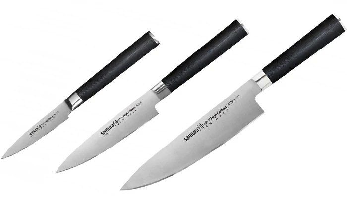 A Samura MO-V sorozata a legegyszerűbb megoldásokból és legegyszerűbb alapanyagokból hozta ki a legnagyszerűbb konyhakéseket. Iskolapéldája a „kevesebb néha több” esetnek. Az egyrétegű acél egyik tulajdonsága sem kimagasló, viszont nincsen kifejezett hátránya sem. Jó éltartás, kellő keménység, könnyű karbantartás és rozsdamentesség. Pont, amire egy konyhának és szakácsának szüksége van. A jellegzetes hengeres markolatok, a markolattüskés kivitel, az impregnált baknik mind hűen hozzák az utánozhatatlan japán stílust. A G10 anyag tökéletesen ellenáll a vegyszereknek és a nedvességnek, nem mérgező és stabil fogást nyújt. Ráadásul az MO-V sorozat darabjai meglehetősen könnyűek is, így sütés-főzés még élvezetesebb velük.
