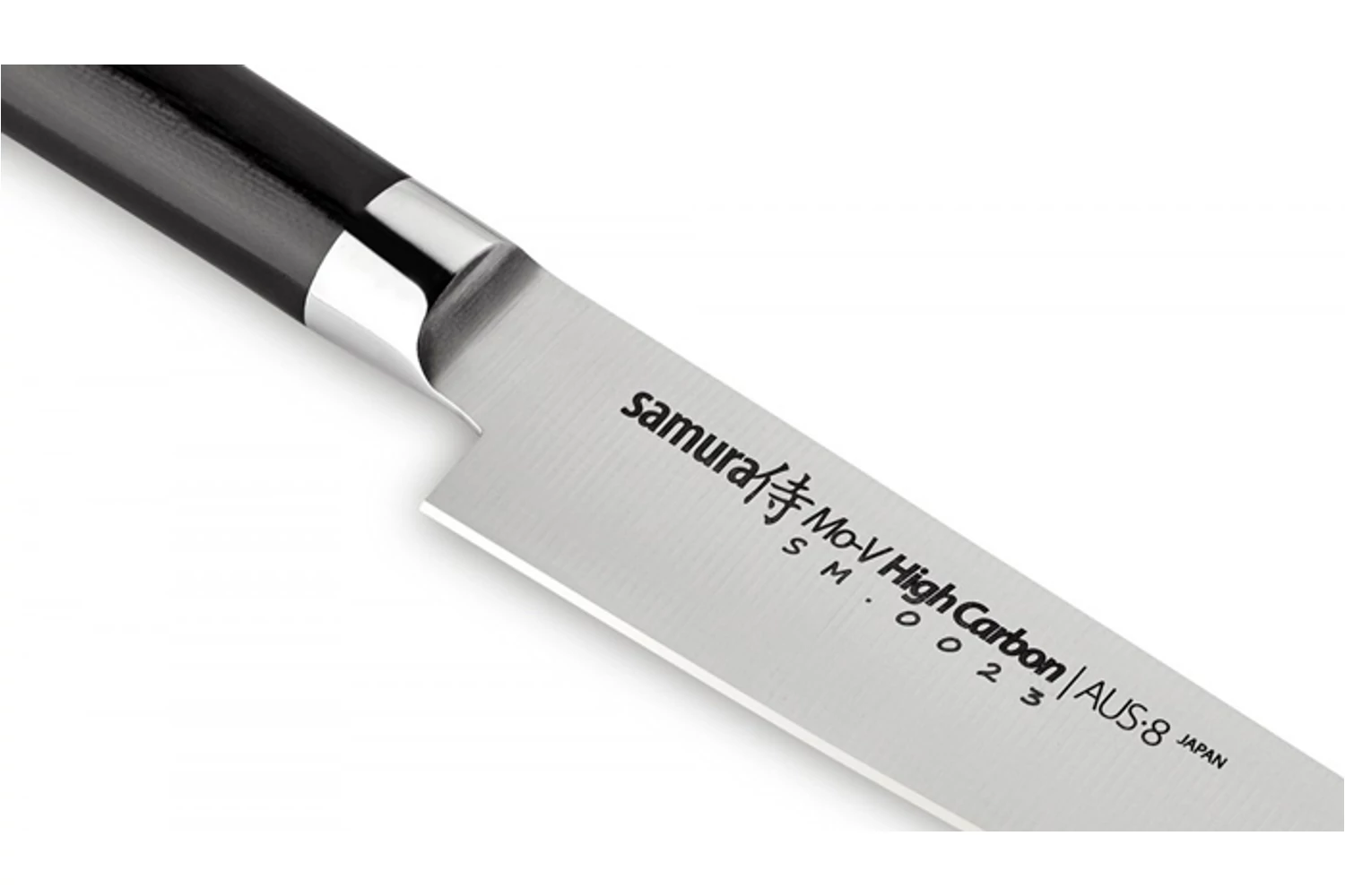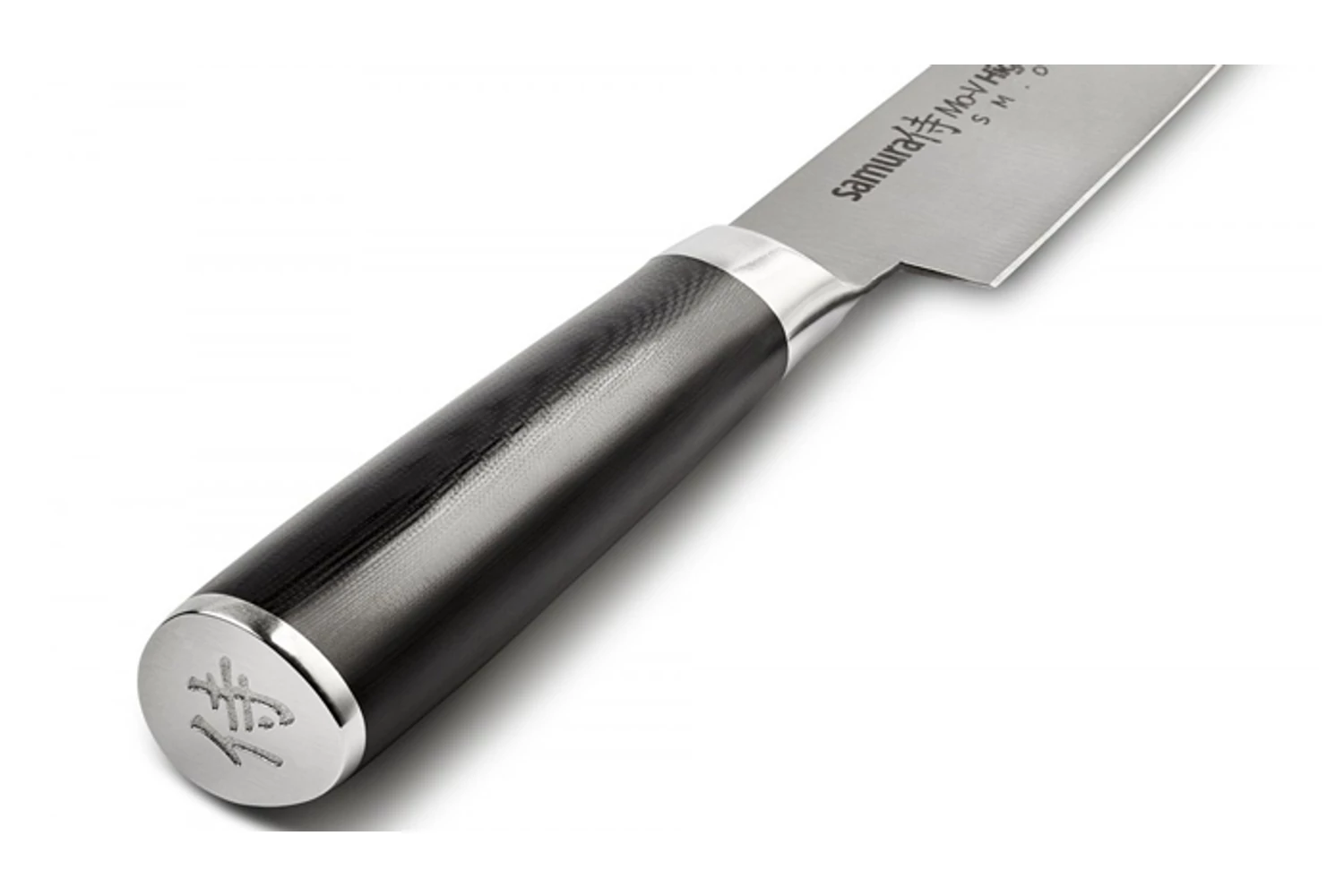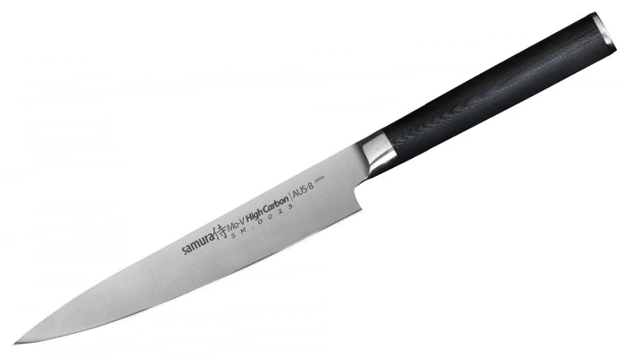 A Samura MO-V sorozata a legegyszerűbb megoldásokból és legegyszerűbb alapanyagokból hozta ki a legnagyszerűbb konyhakéseket. Iskolapéldája a „kevesebb néha több” esetnek. Az egyrétegű acél egyik tulajdonsága sem kimagasló, viszont nincsen kifejezett hátránya sem. Jó éltartás, kellő keménység, könnyű karbantartás és rozsdamentesség. Pont, amire egy konyhának és szakácsának szüksége van. A jellegzetes hengeres markolatok, a markolattüskés kivitel, az impregnált baknik mind hűen hozzák az utánozhatatlan japán stílust. A G10 anyag tökéletesen ellenáll a vegyszereknek és a nedvességnek, nem mérgező és stabil fogást nyújt. Ráadásul az MO-V sorozat darabjai meglehetősen könnyűek is, így sütés-főzés még élvezetesebb velük.
