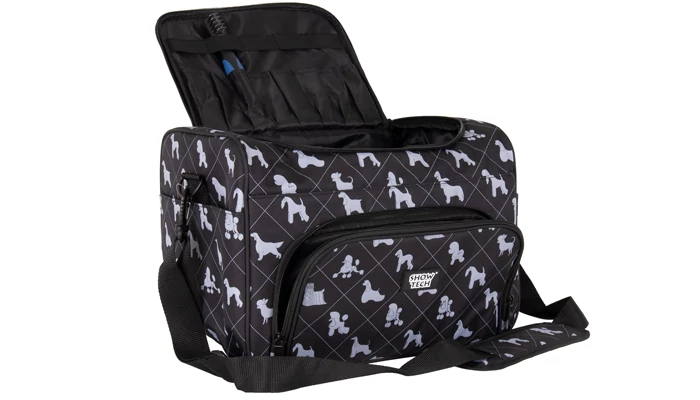 Víz- és Szőrálló anyagból készült, puha oldalú luxus Grooming Táska 6 belső zsebbel és 4 elasztikus hurokkal rendelkezik, hogy az üvegeket függőlegesen tartsa. A cipzáras fedél 8 elasztikus hurkot tartalmaz, a cipzáras elülső zseb pedig 8 rugalmas hurkot tartalmaz ollók, trimmelő kések vagy egyéb szerszámok számára. A deluxe táska vállpánttal és 2 külső zsebbel rendelkezik a táska oldalán. Fekete színben, ezüst K-Design kutyás sziluettekkel.