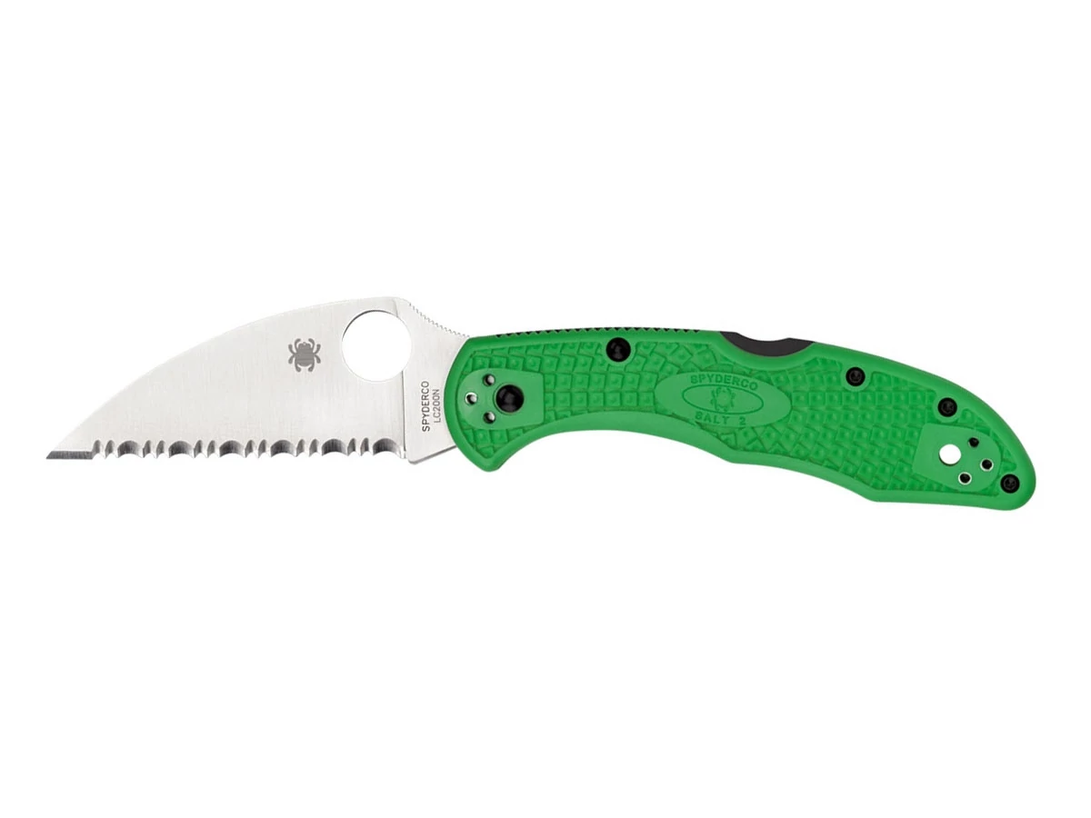 A Spyderco SALT 2 WHARNCLIFFE FRN GREEN SERRATED zsebkés ideális választás a precíz vágásokhoz. A Wharncliffe forma miatt a penge éles, egyenes élével teljesítmény és precizitás érhető el, hasonlóan egy műtőkéssel. A kés kifejezetten ellenálló a korrózióval szemben, köszönhetően az LC200N acélnak.
